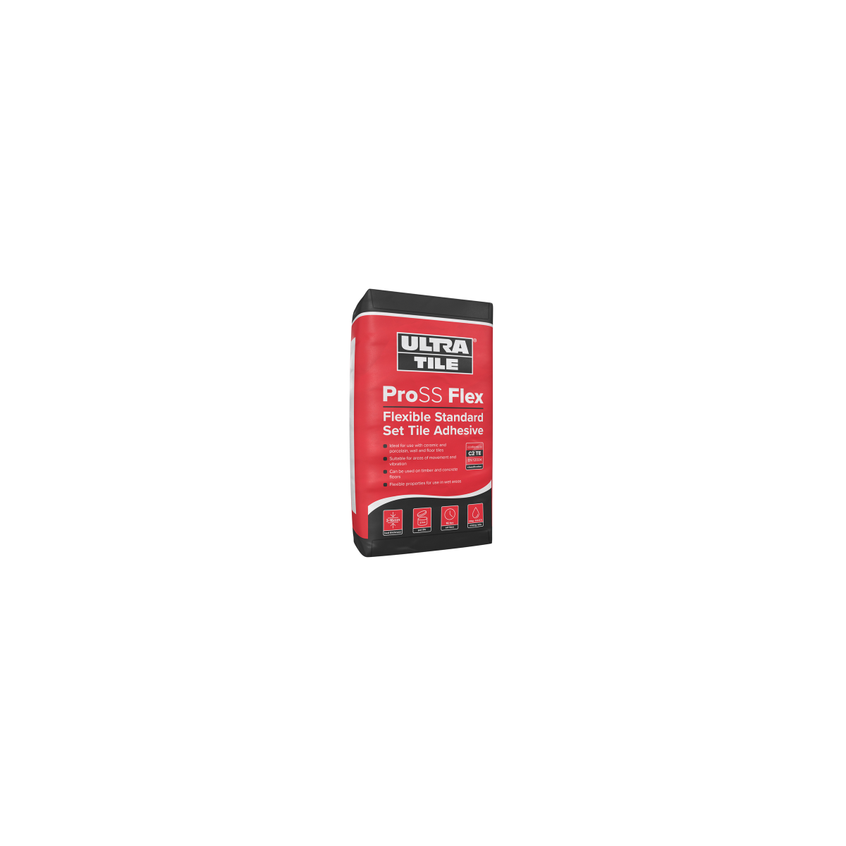 UltraTile ProSS Flex is a single part, standard set, flexible adhesive for wall and floor tiles. It is specially formulated with enhanced adhesion and flexibility for use with ceramic, porcelain and natural stone tiles. UltraTile ProSS Flex is a polymer modified adhesive suitable for use with most common substrates and in areas of movement and vibration.